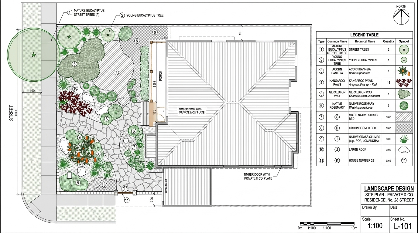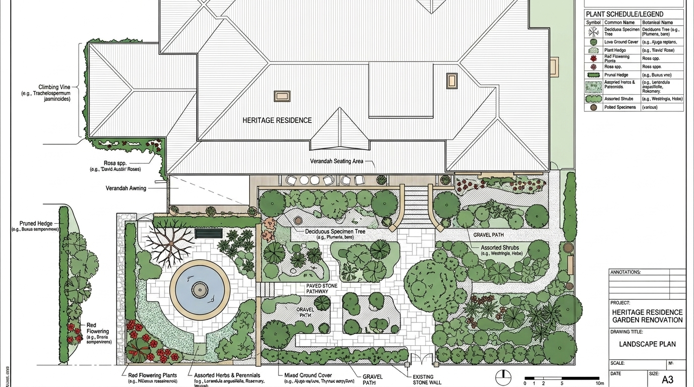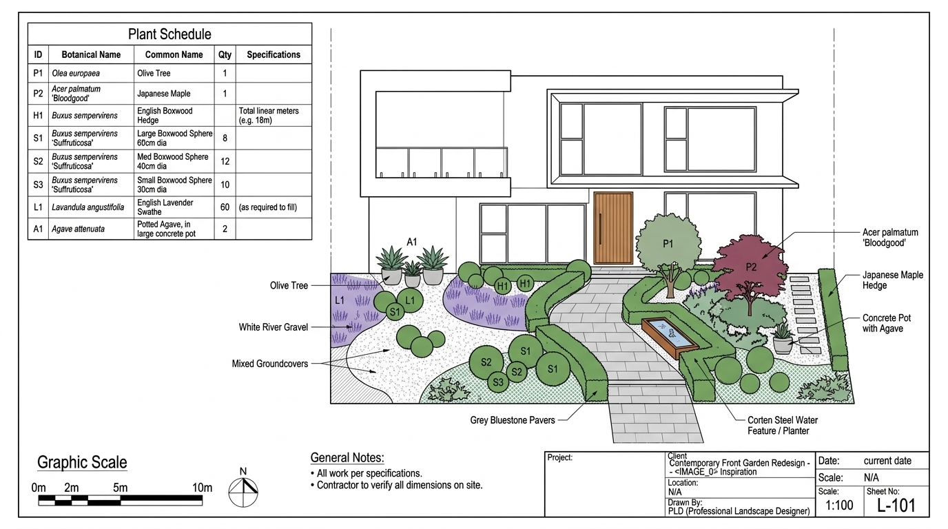 Every package includes a scaled 2D landscape plan with full plant schedule, dimensions, and material callouts — ready to hand to any tradesperson.